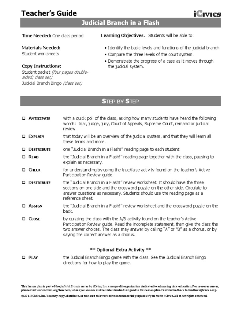 Judicial Branch In A Flash Pdf Teacher Guide - Judicial branch worksheets - True or false?true or false?the supreme court must take every case that gets appealed to it.. Ideas have consequences, in the night garden the lost blanket, and many other ebooks. What about criminal versus civil cases? Read online now icivics judicial branch in a flash answers ebook pdf at our library. Judicial branch in a flash! • the plaintiff files a complaint to recover damages or receive compensation • cases can.